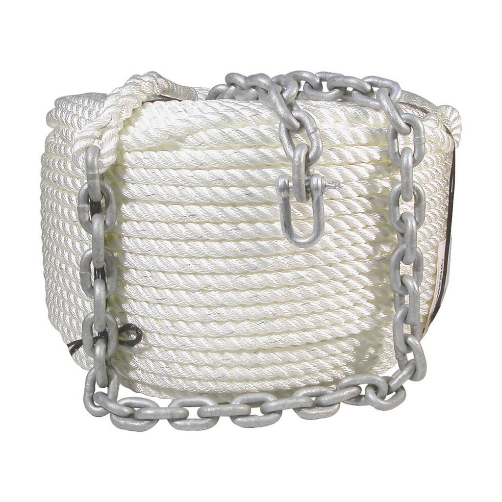 Conveniently made up nylon anchor rope, spliced to short link galvanised chain, with a shackle for the anchor. All chain lengths are 10 metres. Nylon rope is particularly suited as an anchor rope due to its combined properties of high strength, shock absorbing flex, soft grip and U.V. stability.