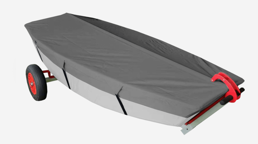Oceansouth Sailboat Cover tailor made design to fit OPTIMIST Dinghy Boat. Shock cord enclosed in hem and buckle fastening for perfect fit. Supplied with Webbing Straps, Buckles, Rope and Cleats